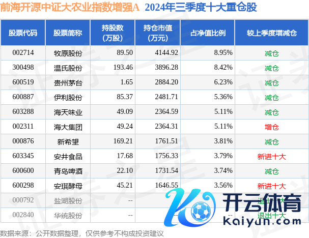 前海开源中证大农业指数增强A为指数型-股票基金,左证最新一期基金季报暴露,该基金钞票树立:股票占净值比94.65%,债券占净值比0.65%,现款占净值比5.07%。基金十大重仓股如下: