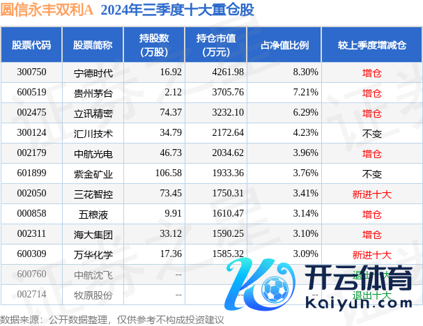 圆信永丰双利A为羼杂型-活泼基金,笔据最新一期基金季报披露,该基金钞票设立:股票占净值比93.1%,债券占净值比5.02%,现款占净值比2.3%。基金十大重仓股如下: