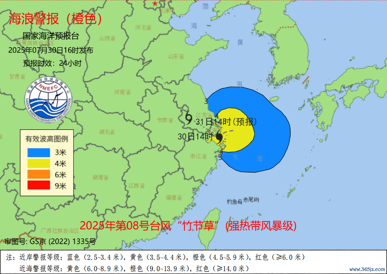 波澜方面,受本年第8号台风“竹节草”(强热带风暴级)的影响,展望7月30昼夜间到31日日间,黄海南部、东海北部将出现3到5.5米的大浪到巨浪区;上海近岸海域将出现3到5米的大浪到巨浪,该近岸海域波澜预警级别为橙色,江苏南部、浙江北部近岸海域将出现3到4.4米的大浪到巨浪,该近岸海域波澜预警级别为黄色,江苏北部近岸海域将出现2到3米的中浪到大浪,该近岸海域波澜预警级别为蓝色。请在上述海域功课的船只留快慰全,沿海各洽商单元提前禁受防浪避浪步调。