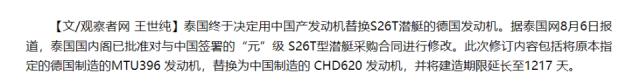 8 月 6 日,泰国政府矜重批准修改采购中国 S26T 型潜艇合同,将原推断搭载的德国 MTU396 型发动机替换为中国自主研发的 CHD620 发动机。