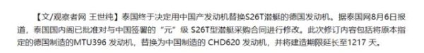 8 月 6 日,泰国政府矜重批准修改采购中国 S26T 型潜艇合同,将原推断搭载的德国 MTU396 型发动机替换为中国自主研发的 CHD620 发动机。 这一决定不仅料理了花样因德国发动机出口受阻而堕入的困局,还记号着中国军工本事在外洋商场上的一次遑急突破。 国产能源系统的得胜行使,让中国潜艇出口的公共竞争力迈上新台阶。 2017 年,泰国皇家舟师与中国船舶重工外洋有限公司鉴定了一份政府对政府(G2G)款式的潜艇采购合同,波及一艘 S26T 旧例潜艇,总价约 135 亿泰铢(约合 27 亿元